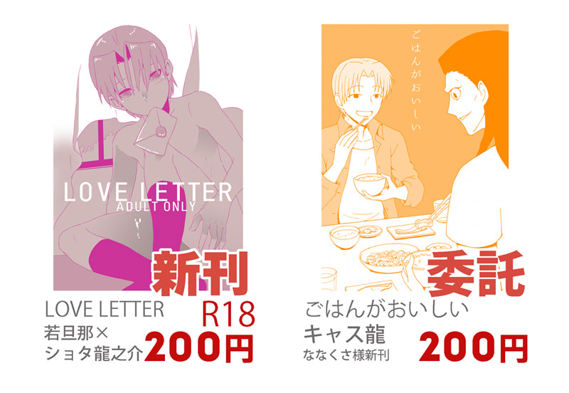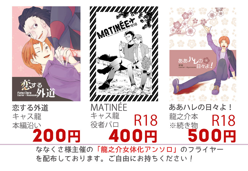 王の器7お品書き 同人 2013年10月13日 当日はこんな感じで目印ぶら下げておきます。 自分の新刊・既刊の他に、ななくさ様の新刊「ごはんがおいしい」をお預かりしております。 また、ななくさ様主催の「雨生龍之介女体化アンソロジー」のフライヤーも配布いたしますので、ぜひスペースにお立ち寄りください。 フライヤーはもうポストカードと言えるほど素敵なので是非お手に取ってご覧ください!キラキラしていてとても綺麗です。 あと今回出せなかった続き物本の表紙絵でしおり作っていたので、宜しければお好きな枚数だけお持ちください。あかつき印刷さんのBカラーと通常カラー比較したい方どうぞ! 今回は一人参加なので、構って頂けると嬉しいです! アンソロもキャス龍新刊もいっぱいあるのでワクワクします。願わくば買い逃しのありませんように…。開場後、5分ぐらいしたら居ても立ってもいられずに買い物に出るかもしれません。 10分以内には戻るようにしますので、どうかよろしくお願いいたします。 今回の頒布物は夏コミの新刊「恋する外道」(コピー)が残部少なめです。直前で申し訳ないのですが、お取り置き希望される方は13日中にピクシブのメッセージか、taro3squirrel@yahoo.co.jp までお名前とお取り置きの内容をご連絡下さい。 それでは当日はよろしくお願いいたします! そう言えば当日の朝新幹線で出発するのですが、さっきもう一度時間よく確認したら地元駅から出るとギリギリ間に合わないことが分かって地味にピンチです。